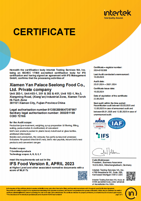圖:燕之屋獲得BRC食品安全全球標(biāo)準(zhǔn)、IFS國際食品標(biāo)準(zhǔn)認(rèn)證