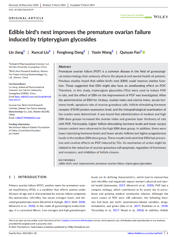近日,燕之屋在食品科學(xué)領(lǐng)域取得了重大突破,其開(kāi)展的一項(xiàng)題為“Edible bird's nest improves the premature ovarian failure induced by tripterygium glycosides”的研究成果被食品科學(xué)領(lǐng)域國(guó)際知名SCI收錄期刊《Food Science & Nutrition》正式收錄。科學(xué)研究表明,燕窩對(duì)免疫制劑雷公藤多苷誘導(dǎo)的卵巢早衰有一定的預(yù)防和治療作用。其作用機(jī)制可能與減少卵巢顆粒細(xì)胞凋亡、調(diào)節(jié)激素和受體、抑制卵泡閉合有關(guān)。