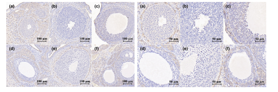 圖:燕窩對(duì)卵巢早衰FSHR蛋白表達(dá)的影響 (a)正常對(duì)照組,(b)模型對(duì)照組,