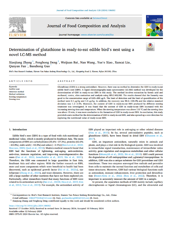 科研成果速遞|燕之屋行業(yè)內(nèi)首次建立測(cè)定即食燕窩中谷胱甘肽含量的方法